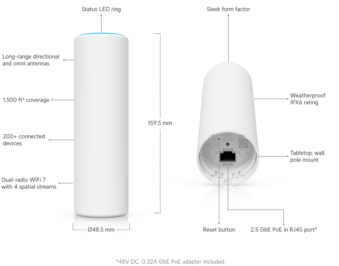Ubiquiti Networks UniFi 7 Mesh, WiFi 7, 2.5GbE LAN, för inom- och utomhusbruk, PoE+, inkl. injektor
