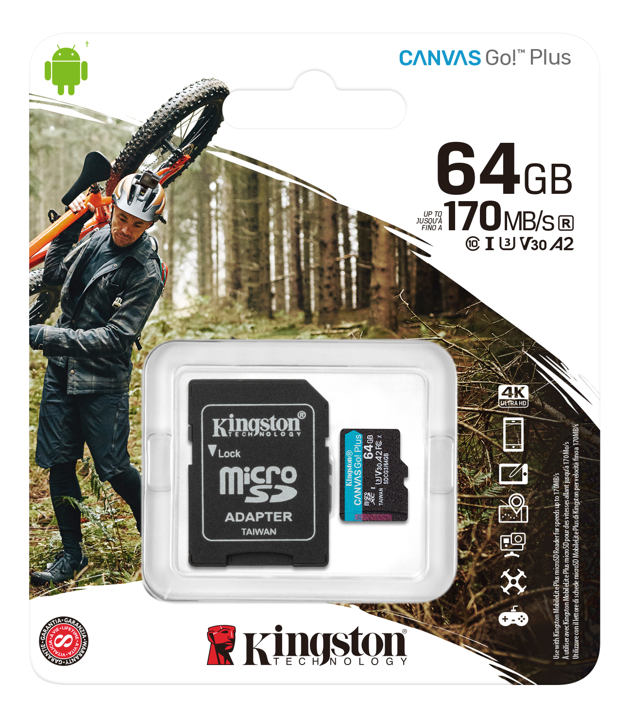 Kingstons Canvas Go! Plus microSD är kortet för riktiga äventyrare som alltid är på jakt efter perfekta ögonblick att fånga med kameralinsen. Tack vare enastående överföringshastigheter upp till 170MB/s* snabbar Canvas Go! Plus microSD-kortet upp och effektiviserar arbetsflödet så att du alltid har mer tid på dig när du ger kreativiteten fria tyglar ute på fältet. Det har stöd för läs- och skrivhastighetsklasserna U3 och V3 och kan användas för att spela in makalösa 4K-videor i ultrahög upplösning, utan att du behöver oroa dig för låga registreringshastighet eller att filmen ska hacka. Dessutom kan du ta enkelt och smidigt ta snabba bildserier. Canvas Go! Plus microSD har stöd för programprestandaklass A2, vilket underlättar arbetsflödet genom högre prestanda för appar på smarta mobiler och surfplattor. Det finns en SD-adapter som att tillgå som tillval, vilket ökar mångsidigheten hos SD-kompatibla enheter. Med Canvas Go! Plus microSD som din digitala målarduk kan du låta världen ge dig inspiration när du tar din kreativitet ut på vägarna.